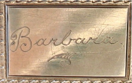 the more formal balls used in the previous century were abandoned. The minuets, danced one couple at a time in a rigidly prescribed order defined by the social rank of the dancers, gave way entirely to less formal dances as quadrilles and dances done with a single partner, like the waltz and the polka. In the new social context the 'Dance cards' ('carnet de bal' in French) were used by ladies to keep track of the gentleman to whom they had promised dances in the course of the evening. The ladies participated in the ball with their personal 'Dance card' contained into an elaborate cover of bone, silver or ivory, often with miniature petit point canvas inserts. They were small enough to be readily portable and, together with the 'posy holder' (tussie mussie), were an indispensable complement to ball's accessorizing. Personal 'Dance cards' were less common at the end of the 19th century when a simple card or a card folded in half were prepared by the 'dance committee', reporting the description of the occasion for the event, the location and the date. The interior of the 'dance card' usually contained a list of the evening's dances, with spaces provided for the names of the gentlemen to whom the lady had promised them. Covers were especially colorful and elaborate and afterwards served as mementos of the occasion. This one is an ancient leather and silk 'dance card holder' with silver 'guilloché' covers, made in 1835 by Birmingham's silversmith Joseph Wilmore. According to Jackson's he entered his mark in the register between 1803 and 1807. He is an interesting maker as it is believed that he also entered his marks in London. This would allow him to set up a London workshop. On the side it has a pencil holder and inside it has three ivory sheets. The book was held closed when the pencil was placed through the silk loops. Faint traces of the names written on the ivory still survive. The silver is fully hallmarked with 'anchor' (Birmingham), duty mark (King William IV), date letter (M = 1835) and 'JW' (silversmith Joseph Wilmore). The rectangular 'reserve' is iscribed 'Barbara' in one side and 'Sarah' on the other. The 'dance card holder' is 3 1/4 in. high (cm. 8) and was bought from an Italian dealer through the Internet. This item is not for sale, but most of my pieces were bought through the Internet. On the bottom and on the right bar of this page there are some links to silver and antique dealers websites |