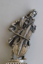 this is a silver statue representing a cello player in 18th century suit standing on an high