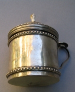 hardened, it was almost impossible to secretly open the letter, because the wax would break.The wax jack was a common endowment for a desk writing set, along with the inkwell, sand container and bell. Occasionally wax jacks were used as a mobile light, perhaps because they were more stable than taper sticks, blew out less easily and gave a better light. The bougie-box or taper-box was a cylindrical container to hold the wax-taper coil when not in use. The cover was originally flat and a tube at the top of the cover permitted the coiled taper to emerge. Some had a chain-attached candle estinguisher. This is a silver wax-jack (bougie box, taper box) made in Italy (Regno Lombardo Veneto) at the mid of the 19th century. It has the shape of a cylindrical container with beaded lid, handle and domed cover. It has hallmarked with "Mondo e Trioni" (800/1000 silver), FA (silversmith) and another unreadable mark. The wax-jack is 3 1/2 in. high (cm. 9) and was bought from an Italian dealer through the Internet. This item is not for sale, but most of my pieces were bought through the Internet. On the right bar of this page there are some links to websites of silver and antique dealers | ||